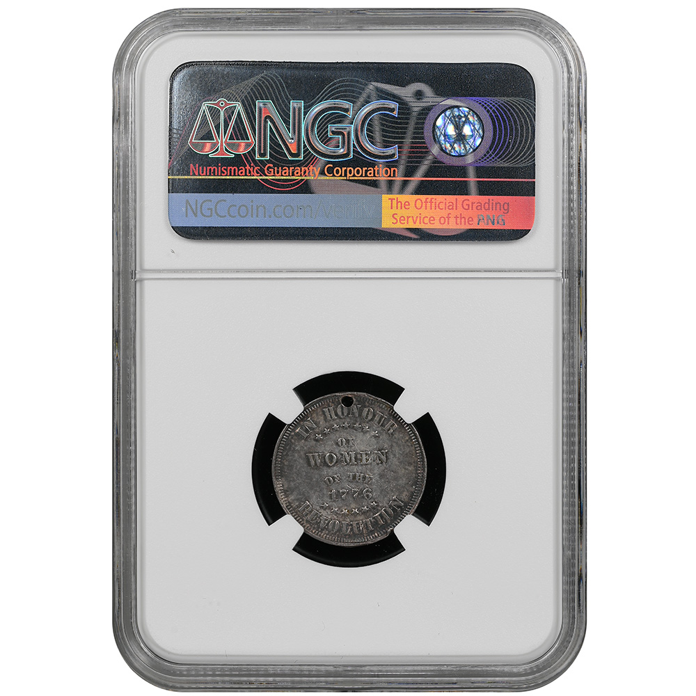 CVC & Collectables presents the small silver centennial medalet honoring the “Women of the Revolution,” cataloged J-CM-49. Struck ca. 1875–76 in silver (AR) and often distributed as wearable souvenirs, this 19 mm piece features Martha Washington on the obverse and a tribute legend on the reverse. Certified by NGC as AU Details with noted edge damage (old suspension hole), it retains attractive antique silver-gray toning and sharp remaining detail.