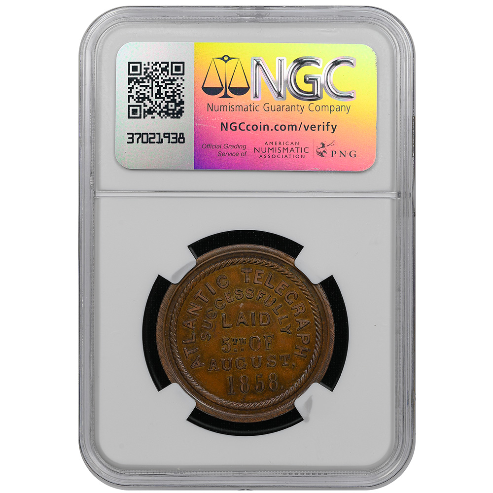 CVC & Collectables proudly offers the 1858 Atlantic Telegraph Laid Medal, struck in copper by renowned engraver George H. Lovett and cataloged as Miller NY-493A. This stunning specimen, graded NGC MS 65 BN, features rich chocolate-brown luster and outstanding design clarity—representing a milestone in 19th-century communication history.