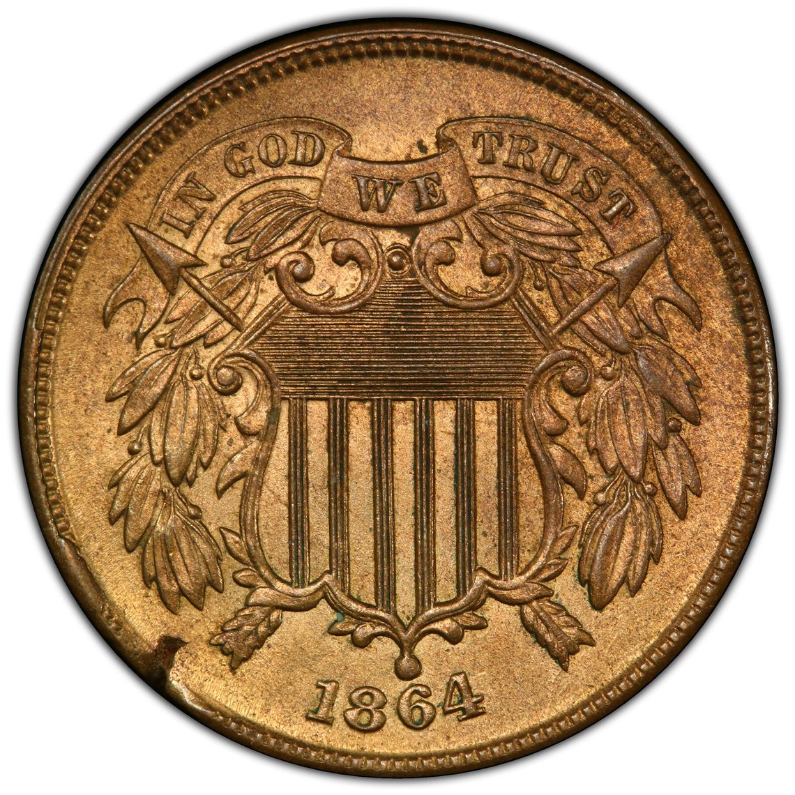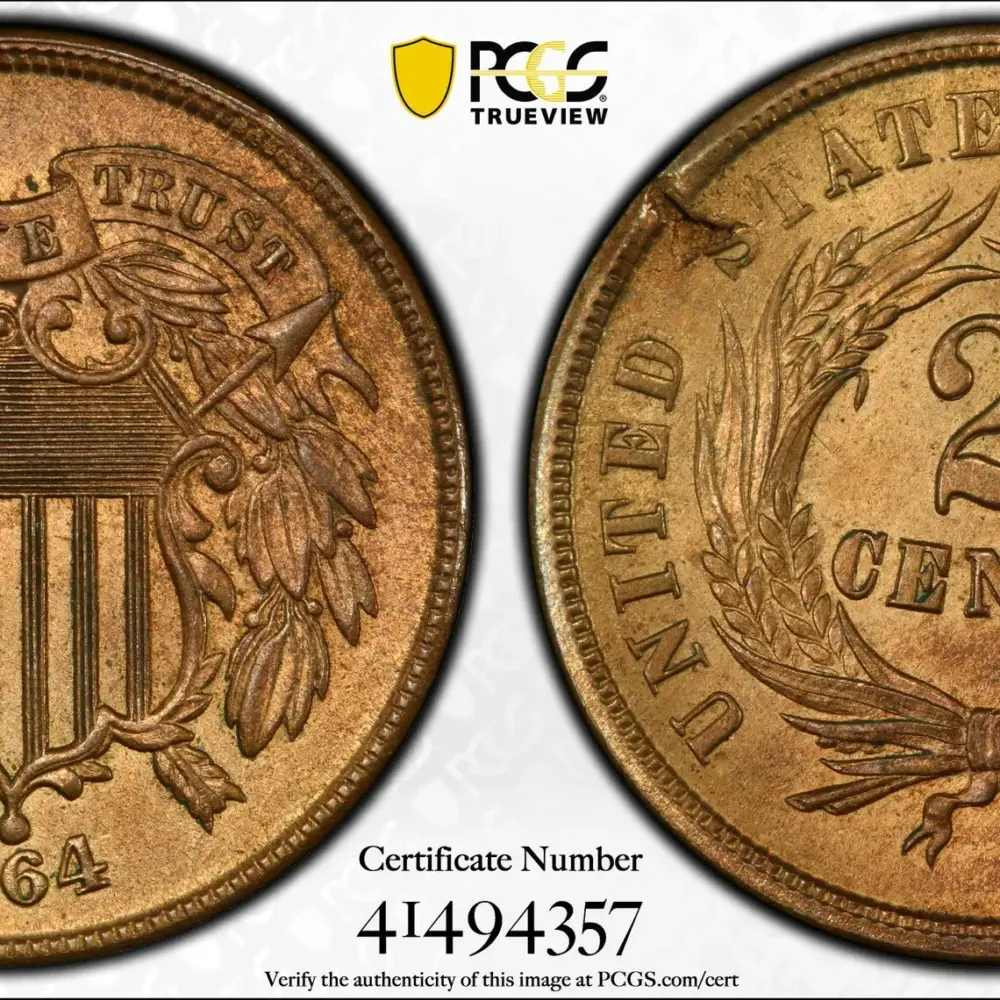 CVC & Collectables proudly presents the extraordinary 1864 2 Cent Large Motto Cracked Planchet, a remarkable coin expertly graded by PCGS as MS64RB. Delve into history as you explore the unique features and superb condition of this numismatic treasure.