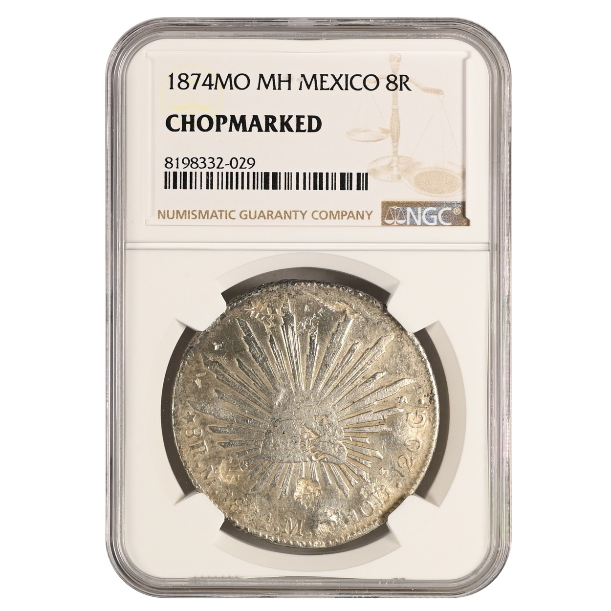 CVC & Collectables presents the 1874 Mexico 8 Reales, struck at the Mexico City Mint under assayer M.H. (Manuel Herrera). Cataloged as KM# 377.6, this iconic Cap & Rays silver coin bears merchant chopmarks, tangible evidence of its role in 19th-century international commerce.