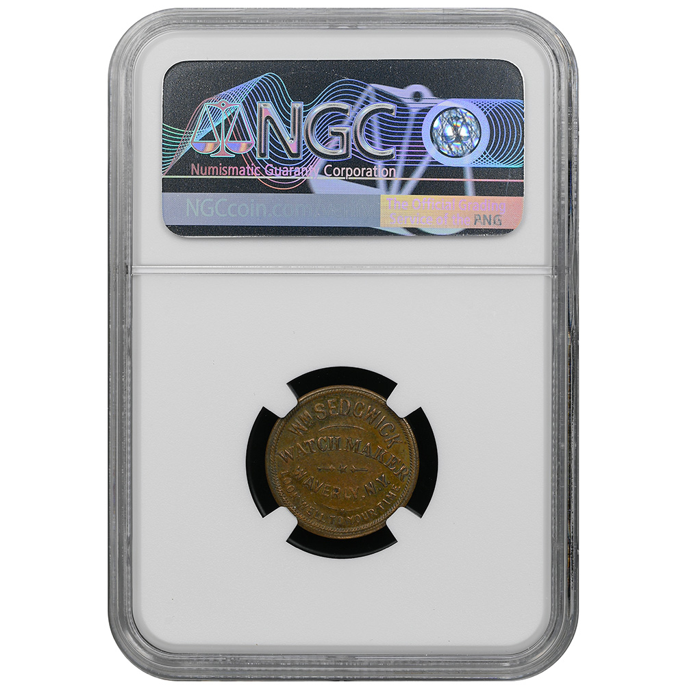 CVC & Collectables presents the 1876 Waverly, New York merchant token issued by WM. Sedgwick, cataloged as R-NY-WV-8A. Struck copper, this token was produced during America’s Centennial year, reflecting both local commerce and patriotic celebration. Certified UNC by NGC, it offers sharp detail and bright original surfaces.