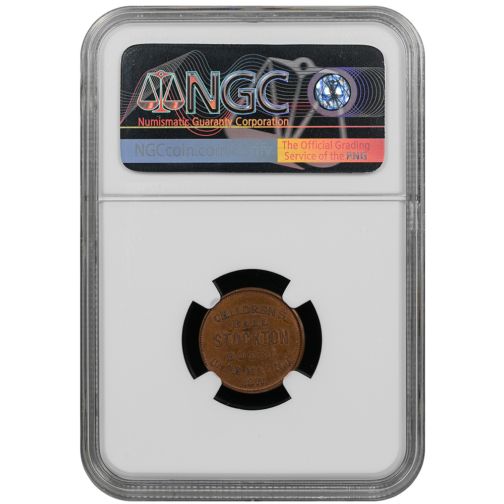 CVC & Collectables presents a lovely Stockton Hotel Washingtonia store card issued for the Children’s Ball at Cape May, New Jersey in 1877, certified NGC MS 63 BN with frosty chocolate luster and sharp legends.