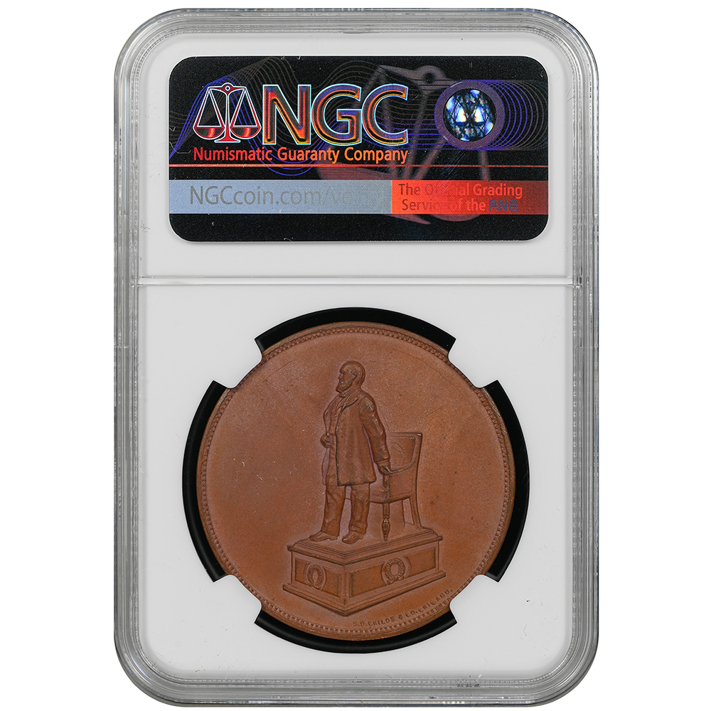 CVC & Collectables presents an undated Garfield Memorial souvenir medal from Cleveland, Ohio, copper 38 mm, certified NGC MS 63 BN. Statue obverse; memorial building reverse—sharp detail and pleasing brown color.