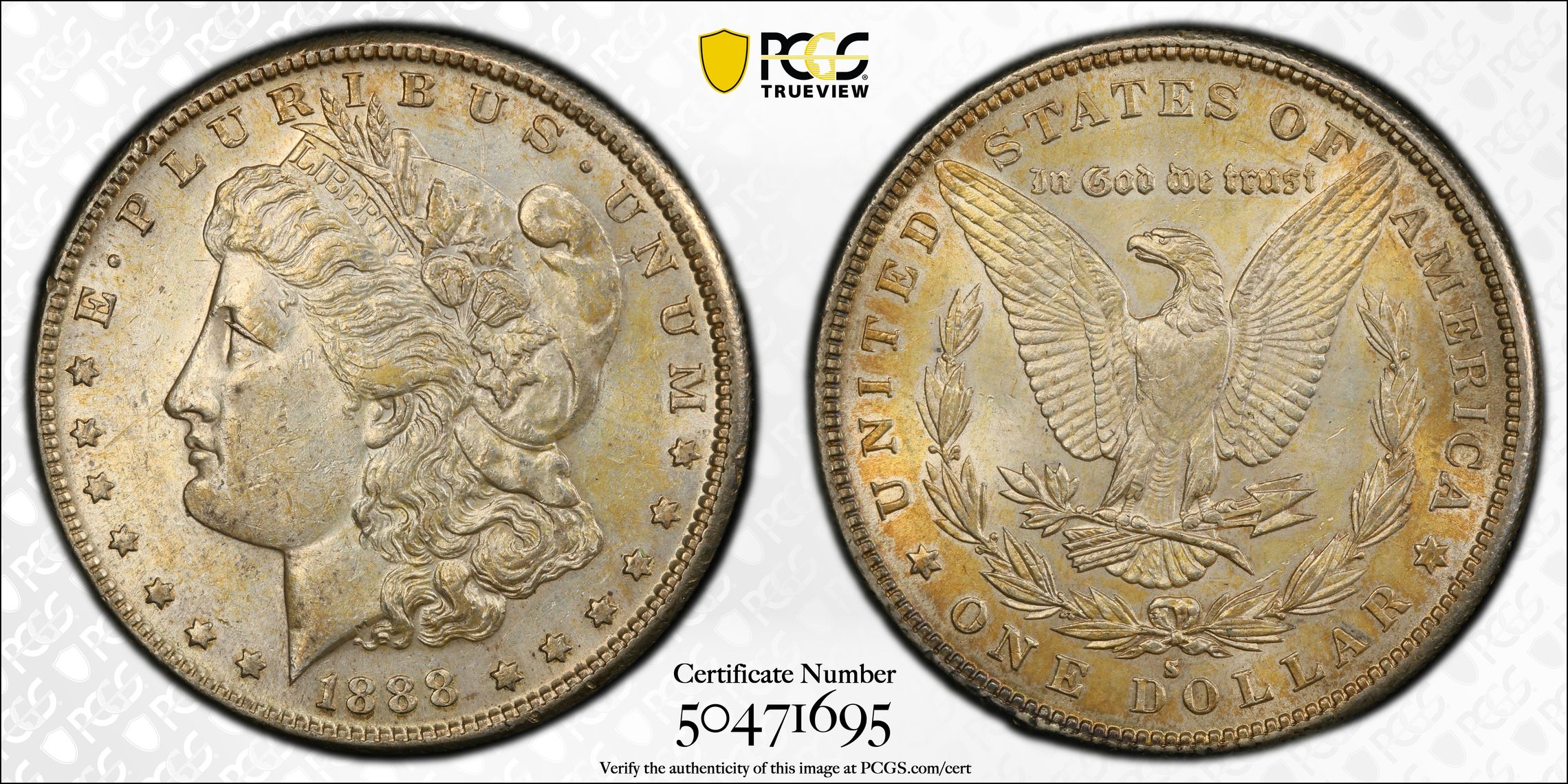- Desirability: The 1888-S is a sought-after date for Morgan Dollar collectors, especially in higher grades like AU55, which still presents much of the coin’s original detail and luster.