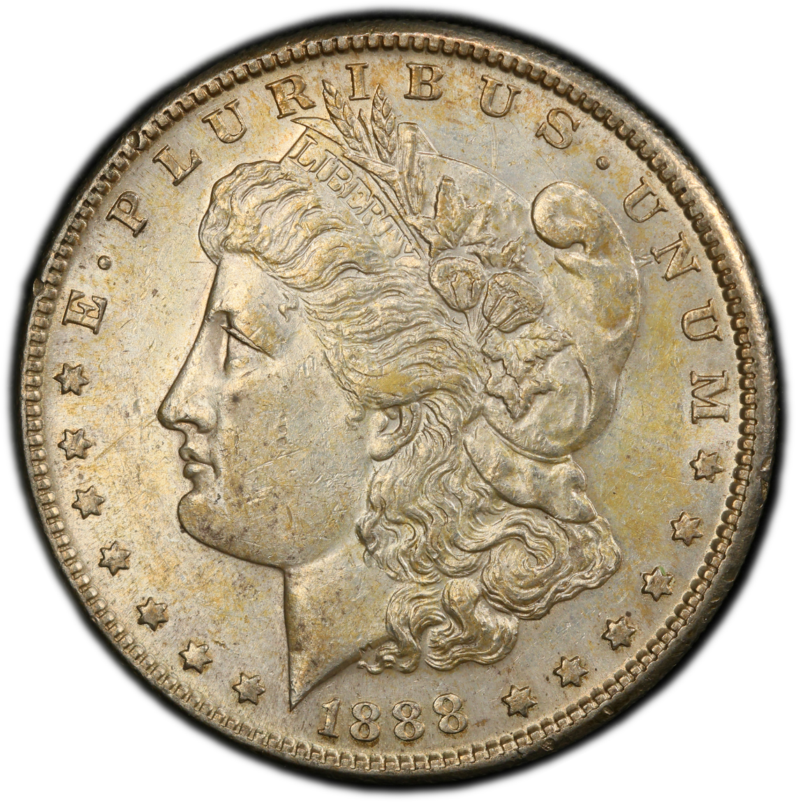 - Depicts a left-facing Lady Liberty wearing a Phrygian cap with “LIBERTY” on a ribbon. The motto “E PLURIBUS UNUM” encircles the top, with the date “1888” at the bottom.