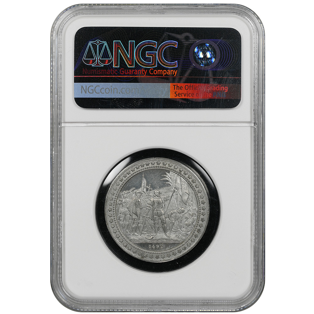 CVC & Collectables presents a World’s Columbian Exposition medal, cataloged E-242, struck in white metal (28 mm) and certified NGC MS 62. Obverse shows the Landing of Columbus (1492); reverse features an eagle with shield and fair legends.