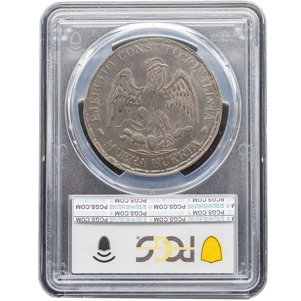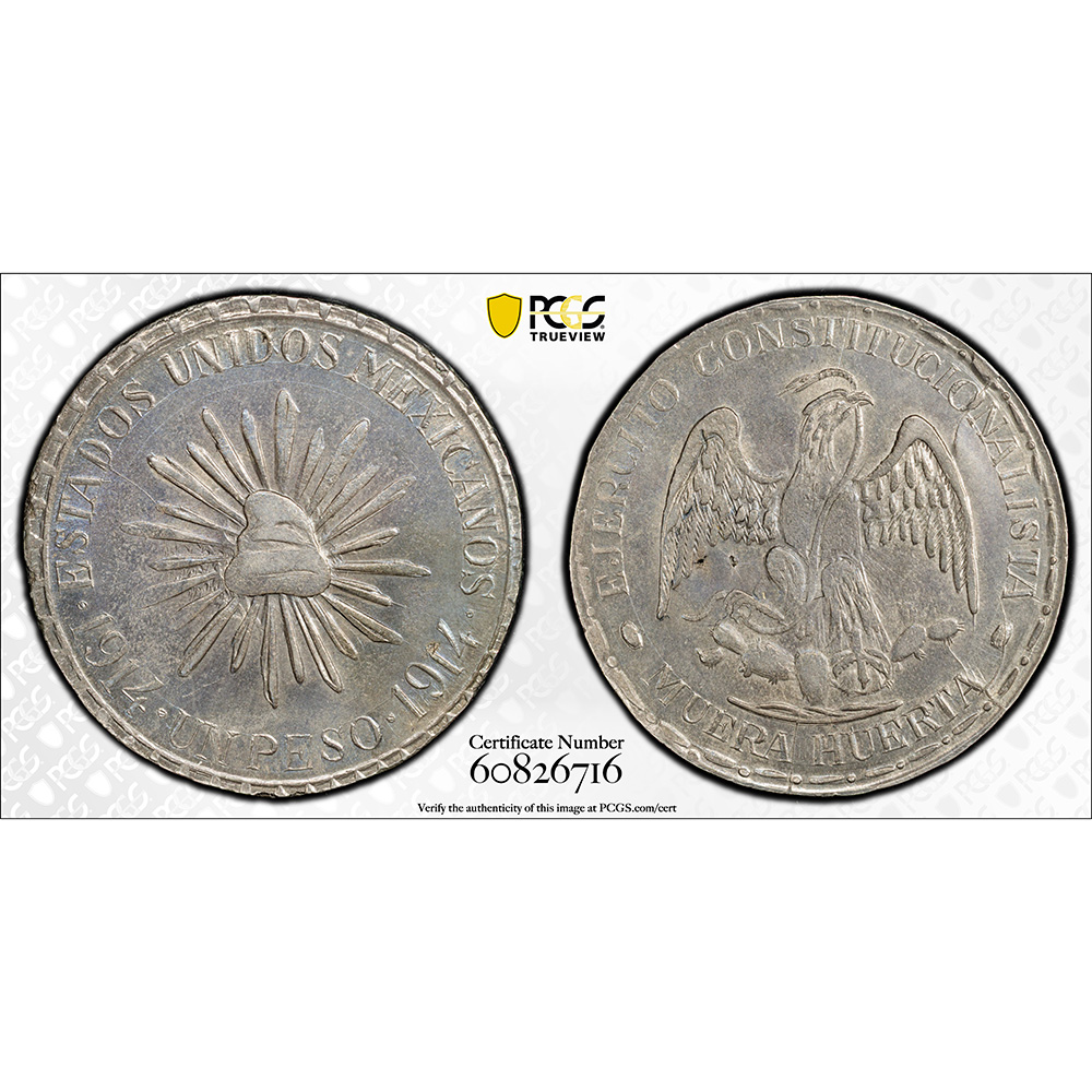 CVC & Collectables is delighted to present the historically significant 1914 Mexico Muera Huerta Peso, minted in Durango during the Mexican Revolution, is a striking and historically significant coin. Graded MS 61 by PCGS, it features uncirculated details with light marks, highlighting its unique place in Mexico’s revolutionary coinage. The phrase “Muera Huerta” (“Death to Huerta”) reflects the widespread opposition to Victoriano Huerta, a contentious figure during this turbulent period.