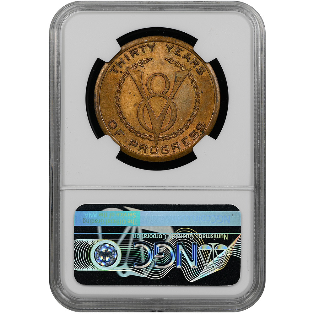 - Reverse: “THIRTY YEARS OF PROGRESS” around a wreath and Ford V-8 emblem