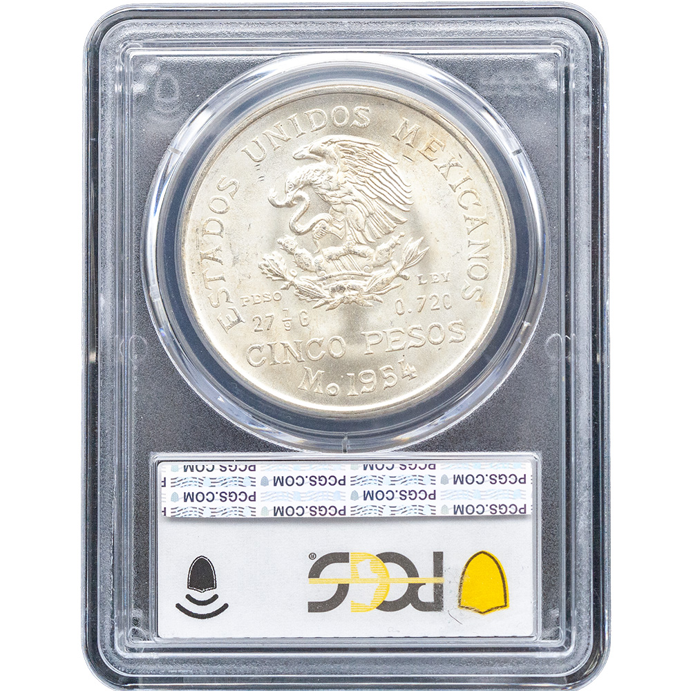 The 1954-Mo 5 Peso Mexico coin is a highly sought-after piece for numismatists and history buffs. Combining historical significance with high-quality craftsmanship, this coin is highly collectible. The PCGS MS 65 grade ensures its value and authenticity, making it a standout piece in any collection.