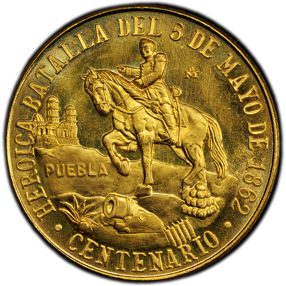 - Obverse: General Ignacio Zaragoza on horseback overlooking Puebla with battlefield elements including cannon; commemorates May 5, 1862