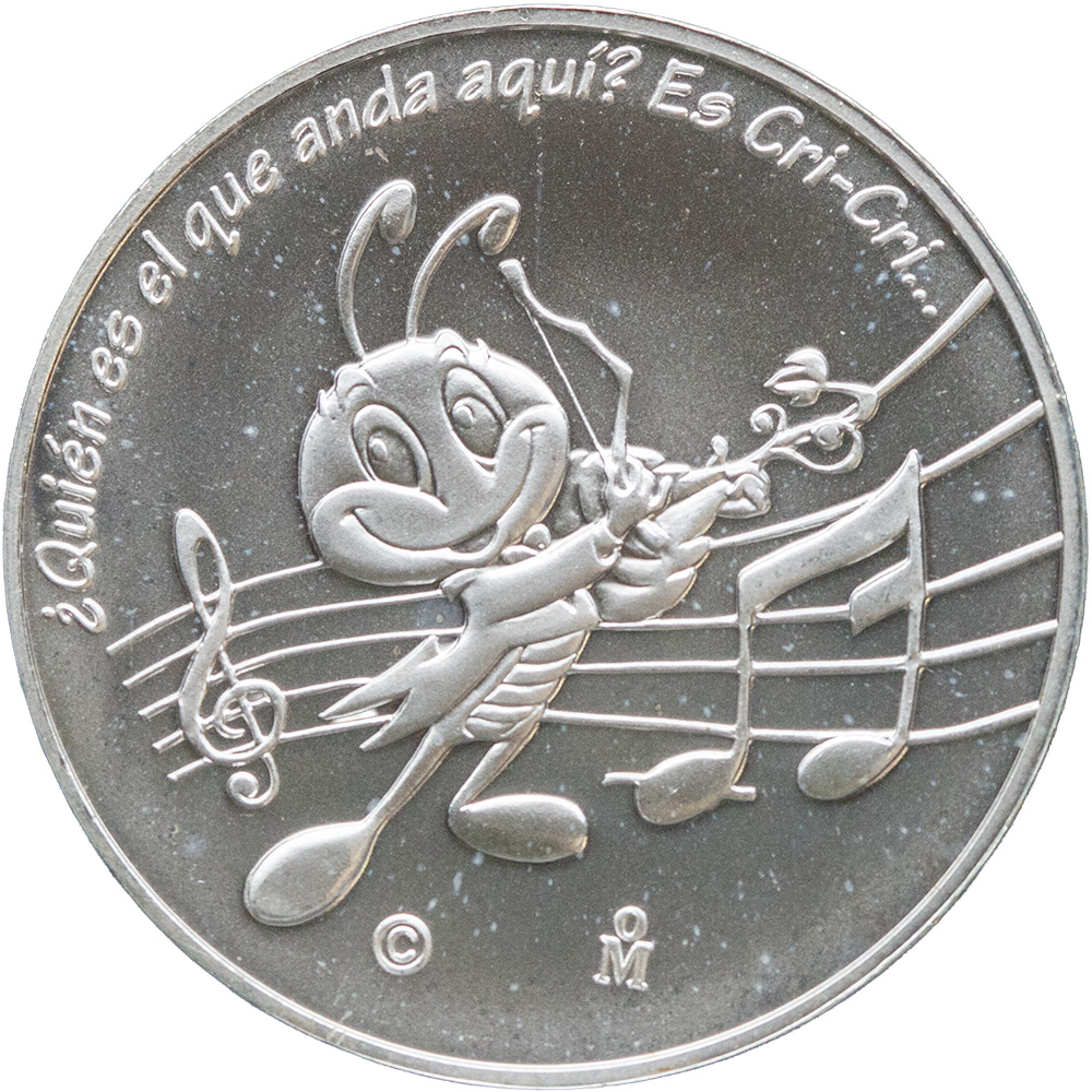 - Obverse: Features Cri-Cri, the iconic singing cricket, joyfully playing the violin over musical notes, with the inscription “¿Quién es el que anda aquí? Es Cri-Cri…”
