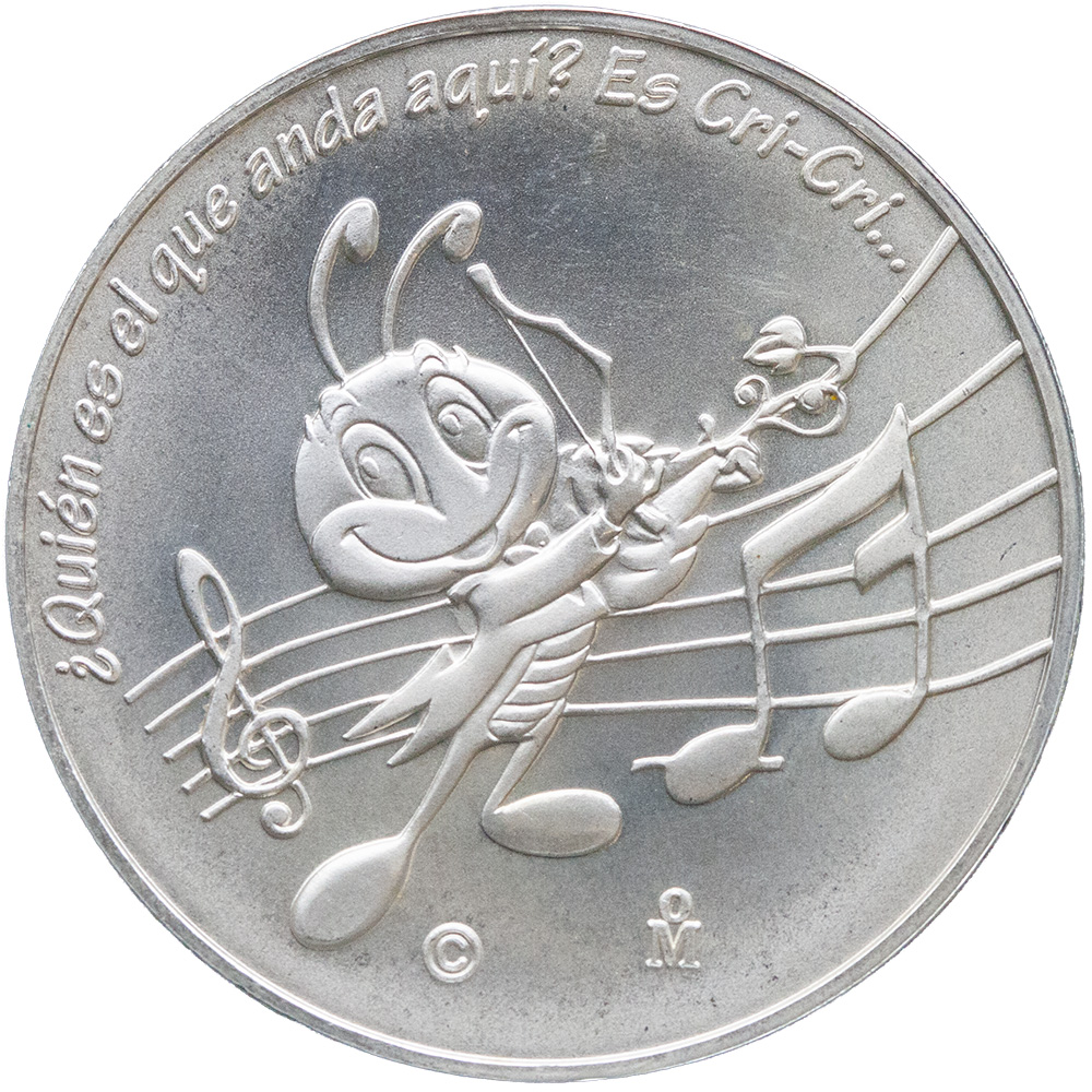 - Obverse: Features Cri-Cri, the famous singing cricket, joyfully playing the violin over musical notes, with the inscription “¿Quién es el que anda aquí? Es Cri-Cri…”