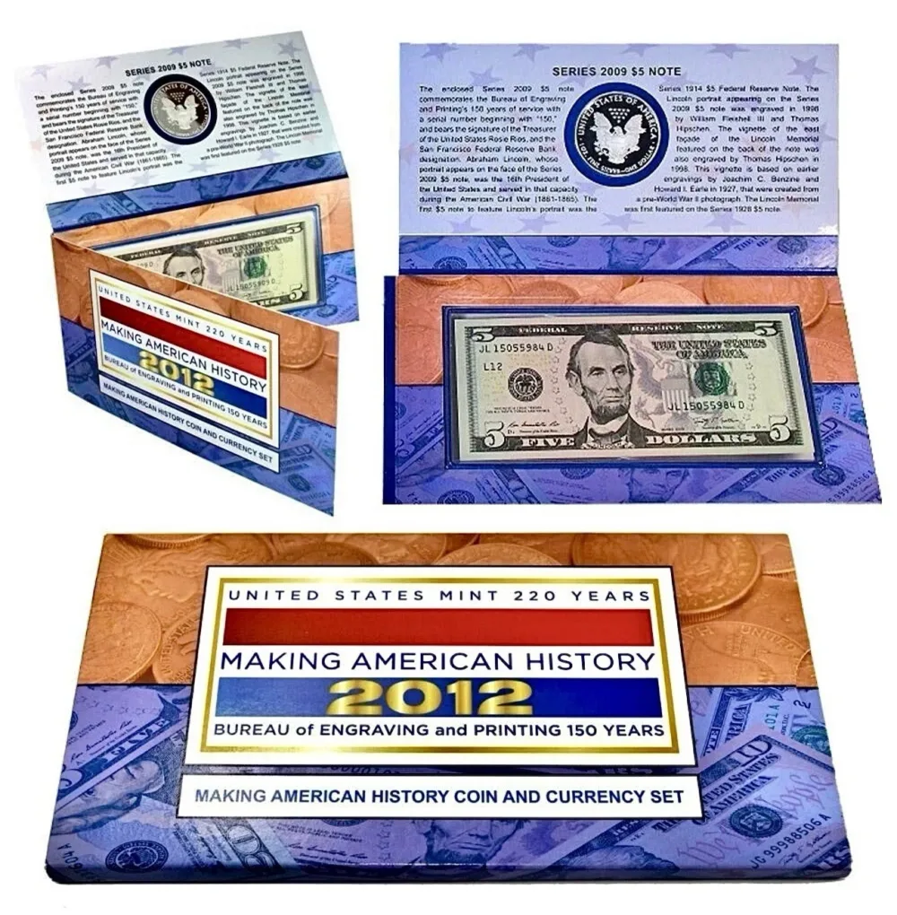 Limited to 100,000 sets, the 2012 Making American History 2-Piece Set remains highly desirable. The proof Silver Eagle is exclusive to this set, and the special-prefix $5 note further distinguishes it from regular issues. Together, they form a unique crossover collectible appealing to both coin and currency enthusiasts.