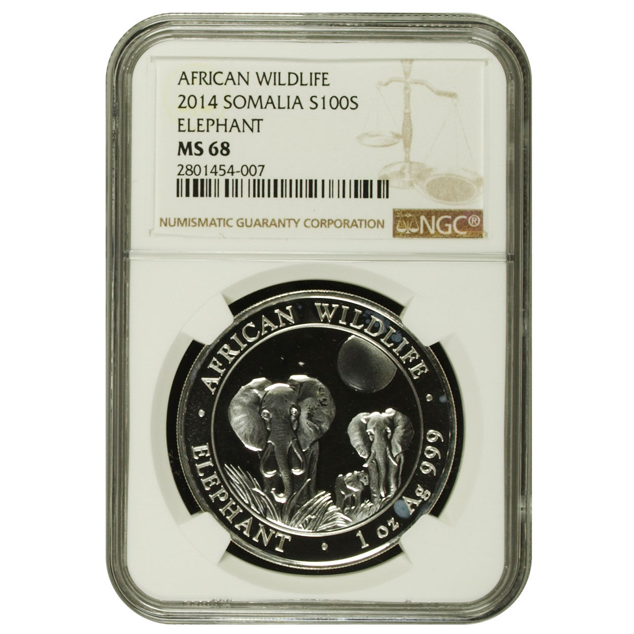 | Reverse Design | Three elephants (adult plus calf) walking across grass under the moon; labeled “AFRICAN WILDLIFE • ELEPHANT • 1 oz Ag 999” |
