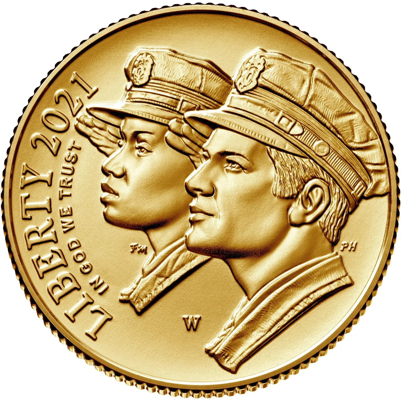 Profiles of a male and female officer saluting; inscriptions “LIBERTY,” “2021,” “IN GOD WE TRUST.”