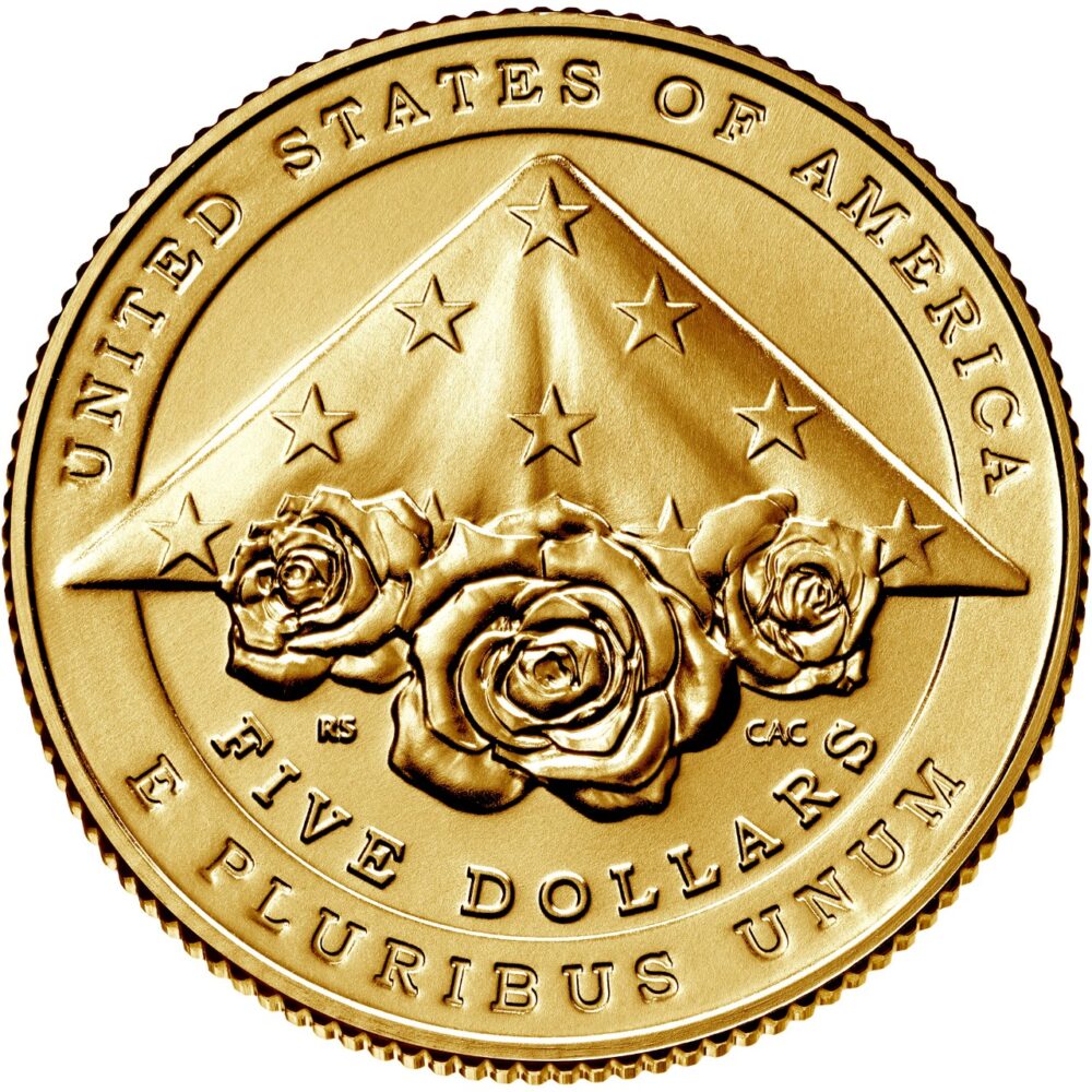 A folded flag with three roses signifying remembrance; inscriptions “UNITED STATES OF AMERICA,” “FIVE DOLLARS,” “E PLURIBUS UNUM.”