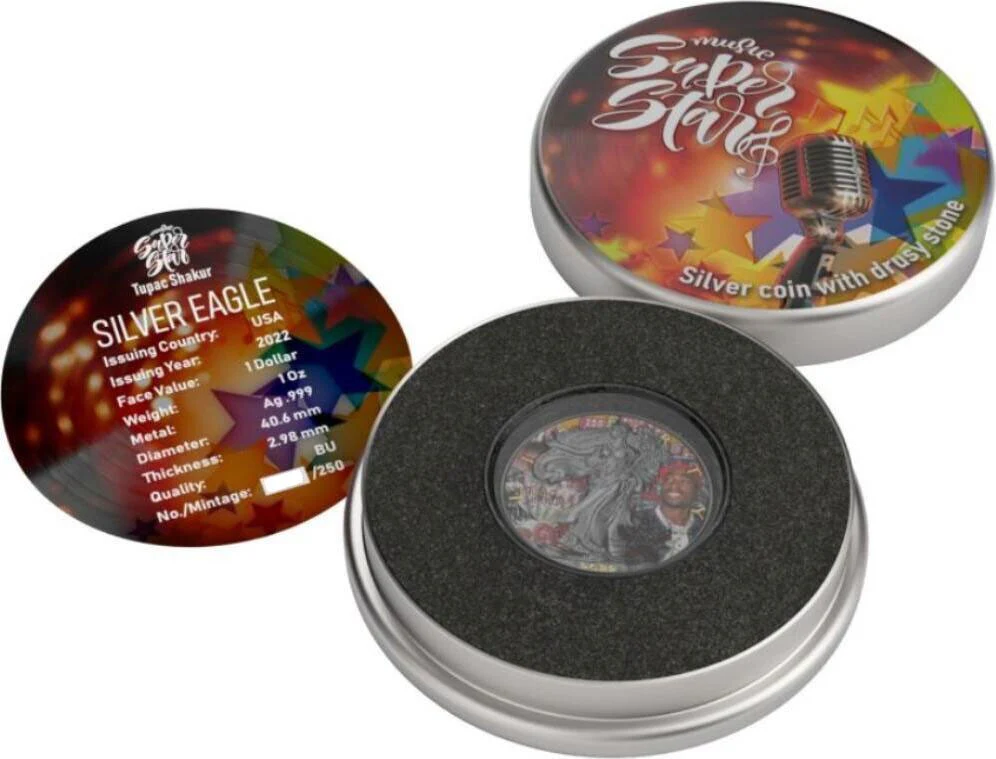 Finish: Brilliant Uncirculated (BU) with selective colorization and drusy stone insert