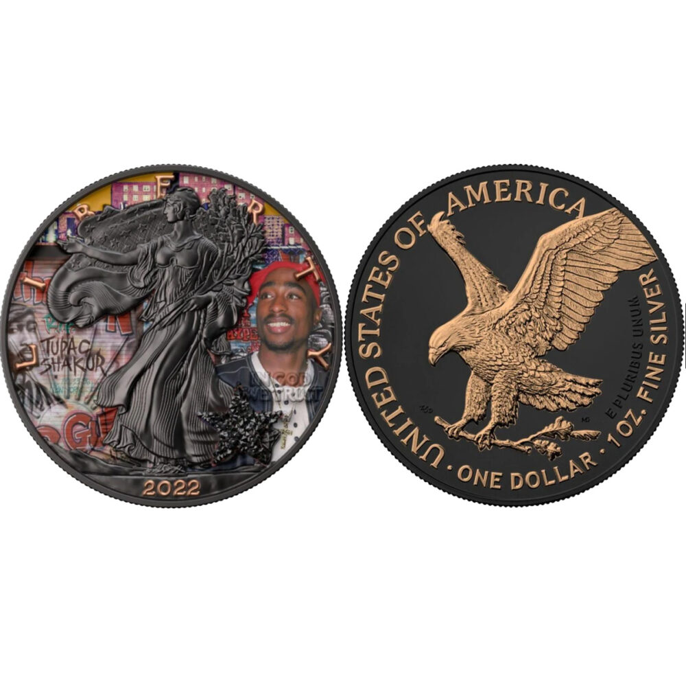 Reverse Design: Depicts a colorized image of Tupac Shakur set against an urban-themed background