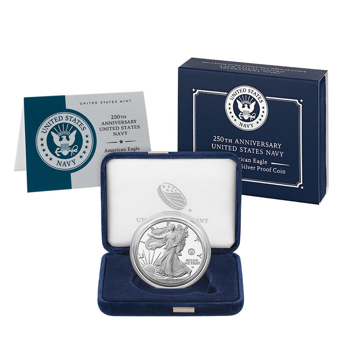CVC & Collectables presents a one-ounce American Silver Eagle struck at San Francisco with a U.S. Navy emblem privy mark honoring the Navy’s 250th birthday. Includes U.S. Mint box and COA.