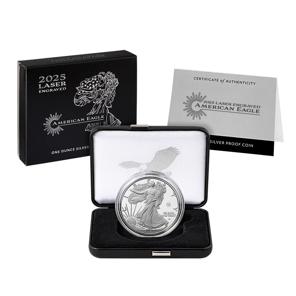 The 2025-W Laser Engraved American Eagle is a landmark issue in the Silver Eagle series, being the first Proof Silver Eagle to carry a laser-engraved privy / “laser beam” mark. Struck at the West Point Mint (denoted by the “W” mint mark), it is limited to a mintage of 100,000 coins.