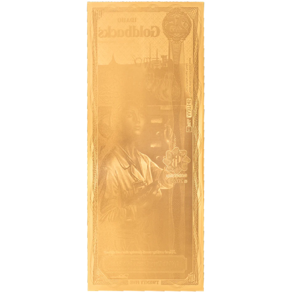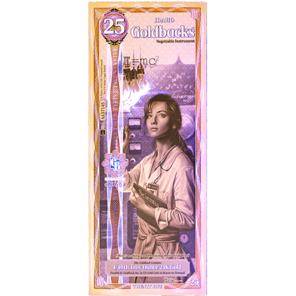 CVC & Collectables presents the 25 Idaho Goldback, a beautifully crafted gold foil note featuring Scientia—the virtue of knowledge. This design commemorates Idaho’s groundbreaking role in nuclear innovation, marking one of the most important scientific achievements of the modern era.