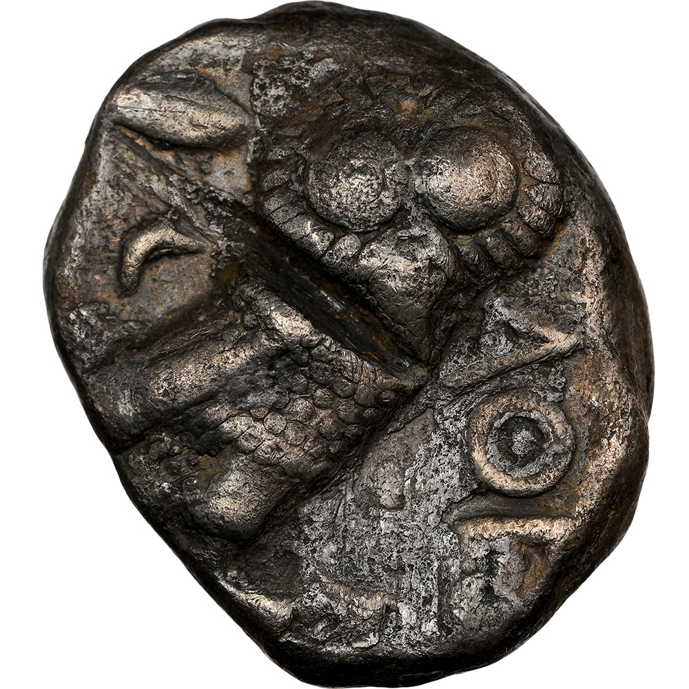 - Obverse: Head of Athena facing right, wearing crested Attic helmet