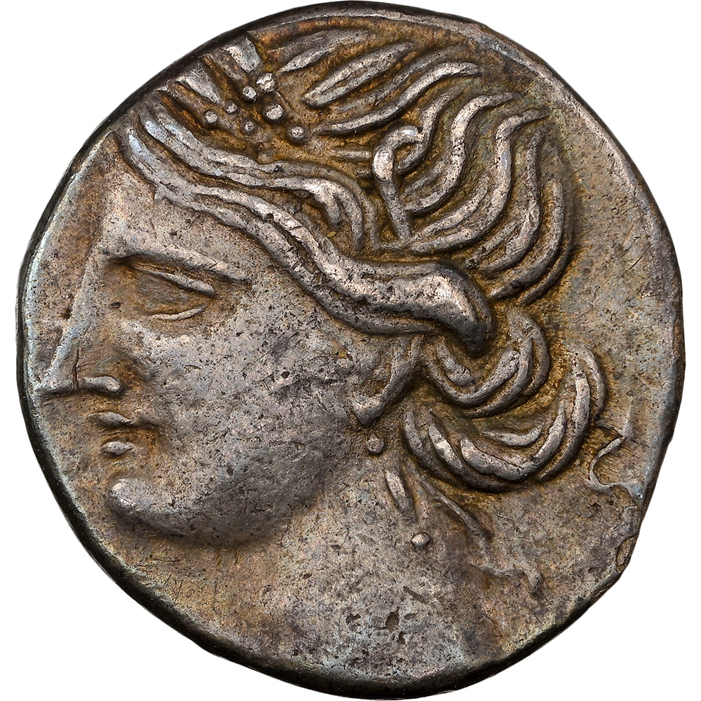 - Obverse: Wreathed head of Tanit left, wearing pendant earring and beaded necklace